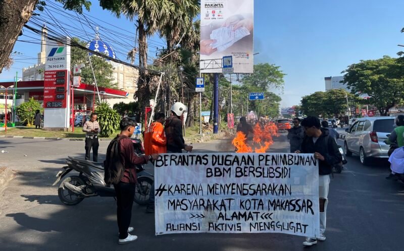 Anatomikata.co.id, Makassar – pada tanggal 17 September 2025 Sekelompok massa dari Aliansi Mahasiswa Menggugat melakukan aksi unjuk rasa di depan sejumlah Stasiun Pengisian Bahan Bakar Umum (SPBU) di Kota Makassar, Selasa (17/9). Aksi ini digelar sebagai bentuk protes atas dugaan praktik penimbangan atau penyaluran Bahan Bakar Minyak (BBM) secara ilegal yang dinilai sangat merugikan masyarakat.
