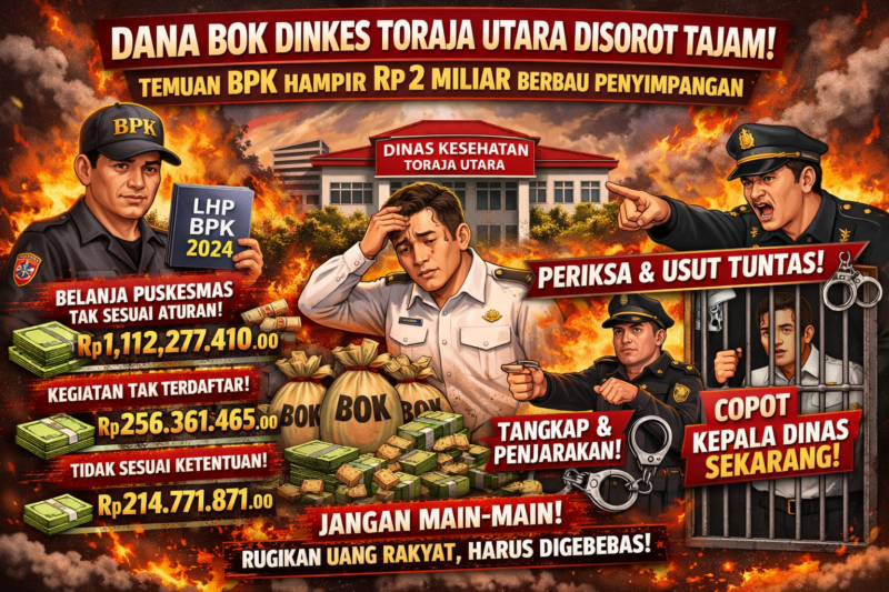 anatomikata.co.id, Toraja Utara – Temuan Badan Pemeriksa Keuangan Republik Indonesia (BPK RI) kembali membuka borok pengelolaan anggaran di daerah. Dalam Laporan Hasil Pemeriksaan (LHP) BPK RI Nomor 50.A/LHP/XIX.MKS/06/2025 atas Tahun Anggaran 2024, terungkap dugaan serius penyimpangan Dana Bantuan Operasional Kesehatan (BOK) pada Dinas Kesehatan Kabupaten Toraja Utara.