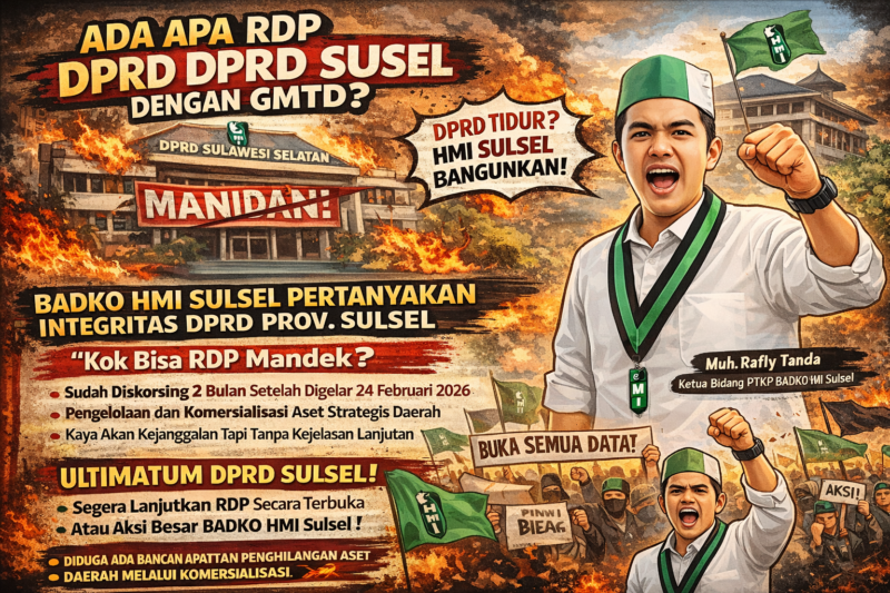 anatomikata.co.id, Makassar — Badan Koordinasi Himpunan Mahasiswa Islam (BADKO HMI) Sulawesi Selatan menilai integritas DPRD Provinsi Sulawesi Selatan patut dipertanyakan menyusul mandeknya Rapat Dengar Pendapat (RDP) dengan PT Gowa Makassar Tourism Development (GMTD) yang hingga kini belum memiliki kejelasan lanjutan.