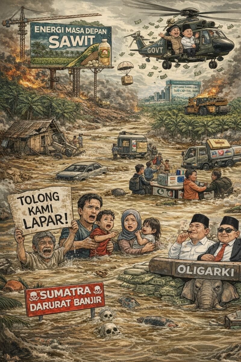 Ironinya, ketika sawit dipromosikan sebagai solusi masa depan energi nasional, negara justru gagal memenuhi kebutuhan paling mendasar warganya hari ini, pangan dan rasa aman. Bantuan kemanusiaan diperlakukan sebagai urusan administratif, sebagian bahkan ditolak atau dipulangkan, sementara para pejabat berlomba menjelaskan prosedur. Negara tampak sangat hadir dalam regulasi, tetapi nyaris absen dalam empati.