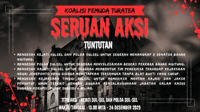 anatomikata.co.id, Jeneponto – Penanganan dugaan korupsi pupuk bersubsidi senilai Rp6 miliar di Kabupaten Jeneponto menuai sorotan tajam dari publik. Koalisi Pemuda Turatea memastikan akan melakukan aksi demonstrasi di Kantor Kejaksaan Tinggi (Kejati) Sulawesi Selatan, sebagai bentuk protes dan kontrol sosial terhadap proses penegakan hukum yang dinilai tidak transparan.