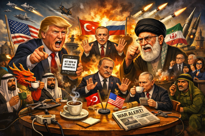 Di tengah ribut-ribut itu, Turki muncul bak ketua RT global. Erdoğan, sang pemain dua kaki, mendadak jadi mediator. Menteri luar negeri Iran mampir ke Ankara, Trump ditelepon, bahkan ada ide video call bertiga, kayak rapat keluarga besar yang ribut tapi malu didengar tetangga. Erdoğan bilang solusi militer itu salah besar, sambil pasang kuda-kuda karena kalau Iran runtuh, pengungsi dan krisis energi bakal mampir dulu ke Turki. Ironisnya, negara NATO yang sering dimarahi Trump justru jadi penambal diplomasi paling darurat.